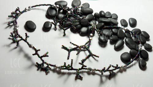Quest'effetto è carinissimo, ed è anche molto semplice da realizzare. Ho trovato lo schema su una rivista. Lì era molto più elaborato (c'era anche un incastonatura... per me è ancora fantascienza XD), io l'ho semplificato estrapolando solo la parte dei corallini ^^. L'errore per me (ma che probabilmente non lo è per gli altri) è che questi piccoli bracci di corallo sono anche sul retro della collana... cioè una trappola per capelli! -_-' Il colore ad ogni modo non per me, eheh.